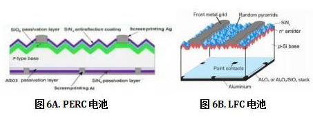 在晶体硅电池背面,目前的铝背面场可以提供一定的场钝化效果,但Al作为受主杂质在硅材料内部的固溶度较低,铝背场提供的场钝化效果比较弱。能够显着改善背面钝化效果的是AlOx/SiNx钝化薄膜,一方面AlOx薄膜内部的固定负电荷密度较高,能够提供较强的场钝化能力;另一方面,在高温烧结过程中,AlOx与P型硅基片界面能够形成一层1~2nm厚的SiOx层,起到介质钝化的作用。对于P型基底,AlOx/SiNx叠层薄膜能够将少数载流子的表面复合速率降低到10cm/s。许多高效电池结构,如PERC、PERC、PERT、LFC等都是以背面AlOx/SiNx叠层钝化薄膜为基础。与常规晶体硅电池相比,PERC电池用AlOx/SiNx叠层薄膜替代铝背场,背面镀完AlOx/SiNx后进行局部的激光剥离出硅基片和背面铝层的接触窗口,背面的光生电流通过该窗口被背面铝层收集。目前PERC电池技术已经成为热门的高效量产技术,其转换效率提升在0.5~0.8个百分点之间。