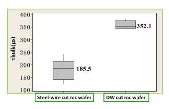 图9所示的双面钝化的少子寿命测试表明,金刚线多晶硅片具有较高的体少子寿命,达到350us左右,优于常规砂浆线多晶硅片。这样就从基础上保证了高效多晶电池的转换效率。
