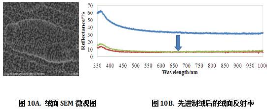 经过先进制绒技术手段得到的绒面尺寸在亚微米范围。从SEM图片(图10A)观察,制绒后的绒面在虫卵形凹坑内部还有许许多多微小的丘陵结构,入射光在虫卵凹坑内的微型丘陵结构表面处形成多次反射,从而极大降低制绒后的反射率。和常规酸制绒相比,其平均反射率能够降低到10%以下。