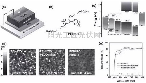 最近,韩国科学技术研究所的研究人员采用了一种的基于1,4-双(4-磺丁基)苯和噻吩基团的聚合物作为空穴传输材料。与传统的PEDOT:PSS(PEDOT是3,4-乙撑二氧噻吩单体的聚合物,PSS是聚苯乙烯磺酸盐)相比,使用这种新颖的聚合物空穴传输材料可以促进钙钛矿层和空穴传输层界面的电荷提取,同时抑制电荷重组,从而降低钙钛矿层和空穴传输层界面的能量损失。使用了这种空穴传输材料的柔性钙钛矿电池可以达到14.7%的转换效率,并且在空气中具有很好的稳定性。这种材料有望成为高效率柔性钙钛矿电池的空穴传输层材料。