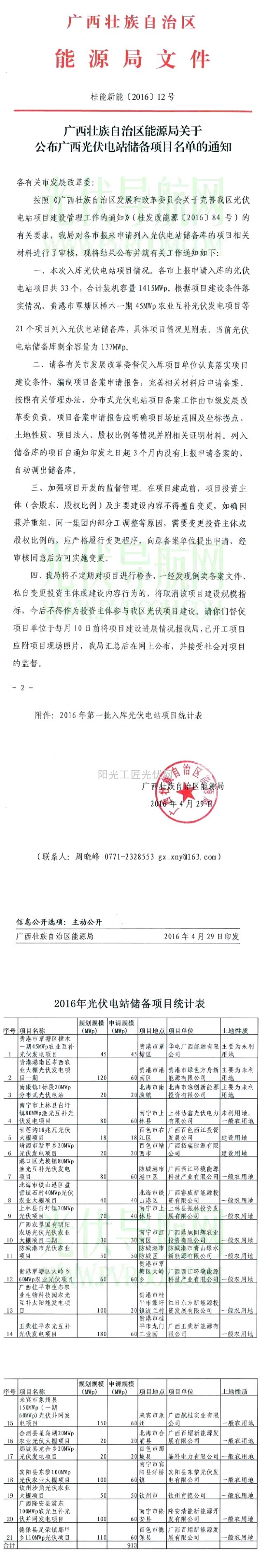 桂能新能〔2016〕12号 广西壮族自治区能源局关于公布广西光伏电站储备项目名单的通知