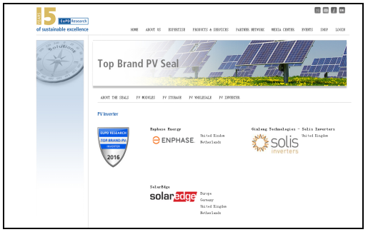 2016年2月,欧洲权威调研机构EuPD授予“全球组串式光伏逆变器专家”宁波锦浪新能源科技股份有限公司旗下“Solis”品牌“2016年度顶尖光伏逆变器品牌”称号,是截止2015年度至目前唯一一家组串式逆变器供应商。