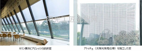 左为麒麟横滨啤酒村的试饮室,右为此次采用的内嵌太阳能电池的玻璃麒麟横滨啤酒村是设在麒麟啤酒横滨工厂内的参观及试饮设施。配合该厂创办90周年重新进行装修,作为神奈川县“薄膜太阳能电池普及扩大项目”的一环,安装了内嵌太阳能电池的窗玻璃。