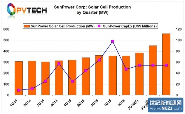 SunPower指出,预计到2016年底总产能将达到1,850MW,较2015年提高450MW。该公司过去四年每年仅实现100MW的增量。预计2016年资本支出将为2.1亿美元至2.6亿美元,而2015年资本支出为2.3亿美元。