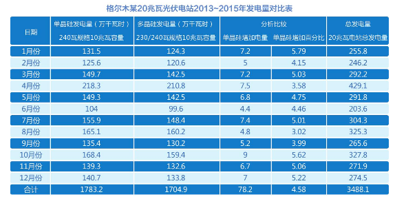 格尔木20兆瓦光伏电站2013~2015年发电量对比表 数据来源:河北能源工程设计公司