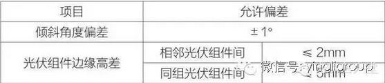 光伏组件常见的安装方式有两种,即螺栓安装和压块安装。无论哪种安装形式,都需保证组件固定螺栓的力矩值满足产品或设计文件的规定。另外,压块安装方式还需特别注意边压块和中压块虚压问题。光伏组件安装时宜按照组件的电压、电流参数进行分类和组串,光伏组件安装允许偏差应符合下表规定。