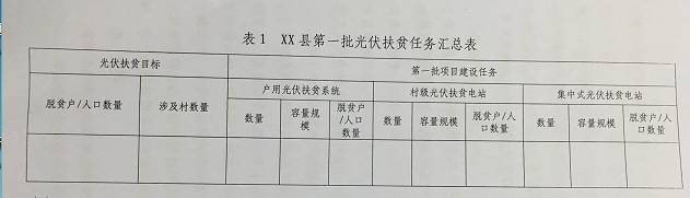 由县光伏扶贫临到小组组织各部门和单位明确第一批光伏扶贫项目及实施方式:本批通过光伏扶贫实现脱贫人口XX人、XX户,其中,共涉及XX个国家级贫困县、XX个建档立卡贫困村、建档立卡贫困户XX户、XX人;涉及非国家级贫困县XX个、非建档立卡贫困村XX个、贫困户XX户、XX人。共拟建设户用系统XX个、容量XXMWp,村级电站XX个、总容量XXMWp,大型地面电站XX个、总容量XXMWp。有关汇总信息填写表1.