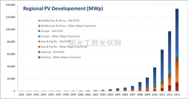 下方的图表中表明了近年来全球光伏行业发展和发电量的比例:
