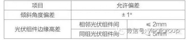 光伏组件常见的安装方式有两种,即螺栓安装和压块安装。无论哪种安装形式,都需保证组件固定螺栓的力矩值满足产品或设计文件的规定。另外,压块安装方式还需特别注意边压块和中压块虚压问题。光伏组件安装时宜按照组件的电压、电流参数进行分类和组串,光伏组件安装允许偏差应符合下表规定。