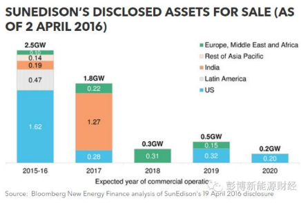 2016年4月19日,也就是申请破产的两天前,SunEdison公司公布了一份共计产能5.3GW项目的匿名清单。这份清单已交由公司的债权人,旨在寻求出售机会,并偿还债务人的持有资产贷款。这些项目分布在12个国家,涵盖了项目发展过程的早期至晚期阶段,但这仅仅是SunEdison资产的一部分。