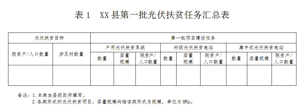由县光伏扶贫领导小组组织各部门和单位明确第一批光伏扶贫项目及实施方式:本批通过光伏扶贫实现脱贫人口XX人、XX户,其中,共涉及XX个国家级贫困县、XX个建档立卡贫困村、建档立卡贫困户XX户、XX人;涉及非国贫县XX个、非建档立卡贫困村XX个、贫困户XX户、XX人。共拟建设户用系统XX个、容量XXMWp,村级电站XX个、总容量XXMWp,大型地面电站XX个、总容量XXMWp。有关汇总信息填写表1。
