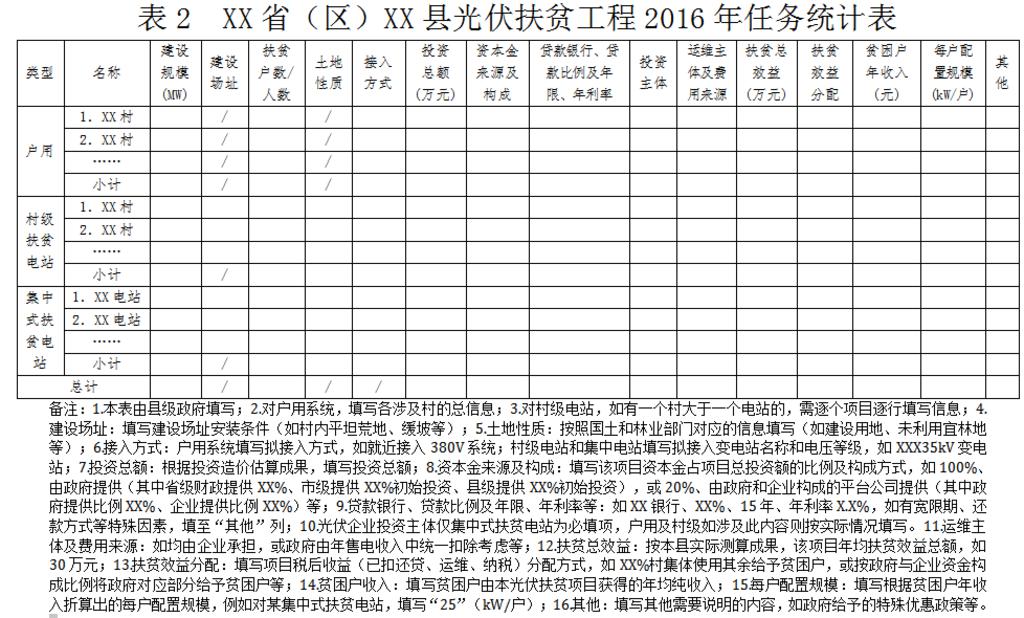 由县光伏扶贫领导小组组织各部门和单位收集和整理相关数据和文件,统筹考虑贫困户地域分布、贫困户所在地土地使用和电网接入条件等,因地制宜采用一种或多种建设形式,分阶段明确光伏扶贫项目及实施方式。相关材料汇总至县经发局后,由县经发局汇总编制以下文档信息,并填写表2(对应信息同步在信息系统内填报);由县扶贫部门汇总各项目涉及贫困人员建档立卡信息,在信息系统内填报(数据格式见表3)。
