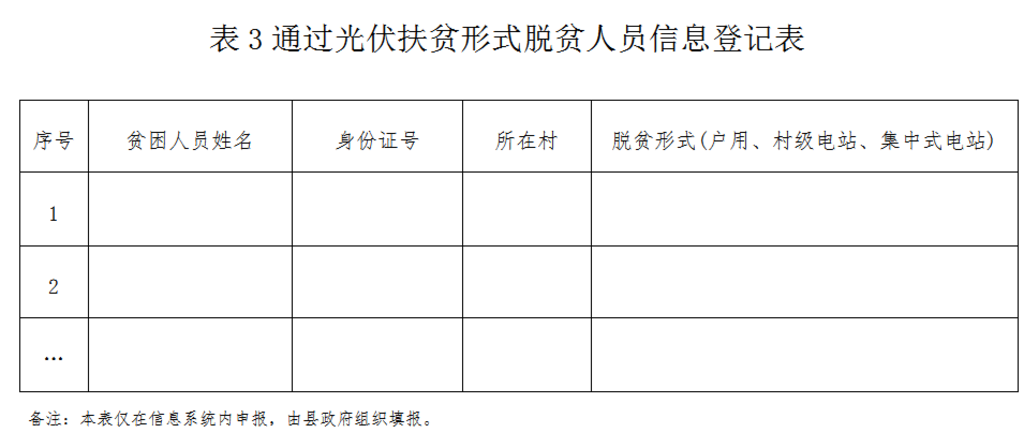 光伏精准扶贫对象的确定。县扶贫部门负责提出光伏扶贫对象的确定原则,统计光伏扶贫对象所在的贫困村名、贫困户数和人数、贫困程度,收集光伏扶贫对象的建档立卡信息。(最终各贫困户的信息均应在国家能源局依托水电水利规划设计总院建立的全国可再生能源信息管理系统中的光伏扶贫管理子系统中登记)