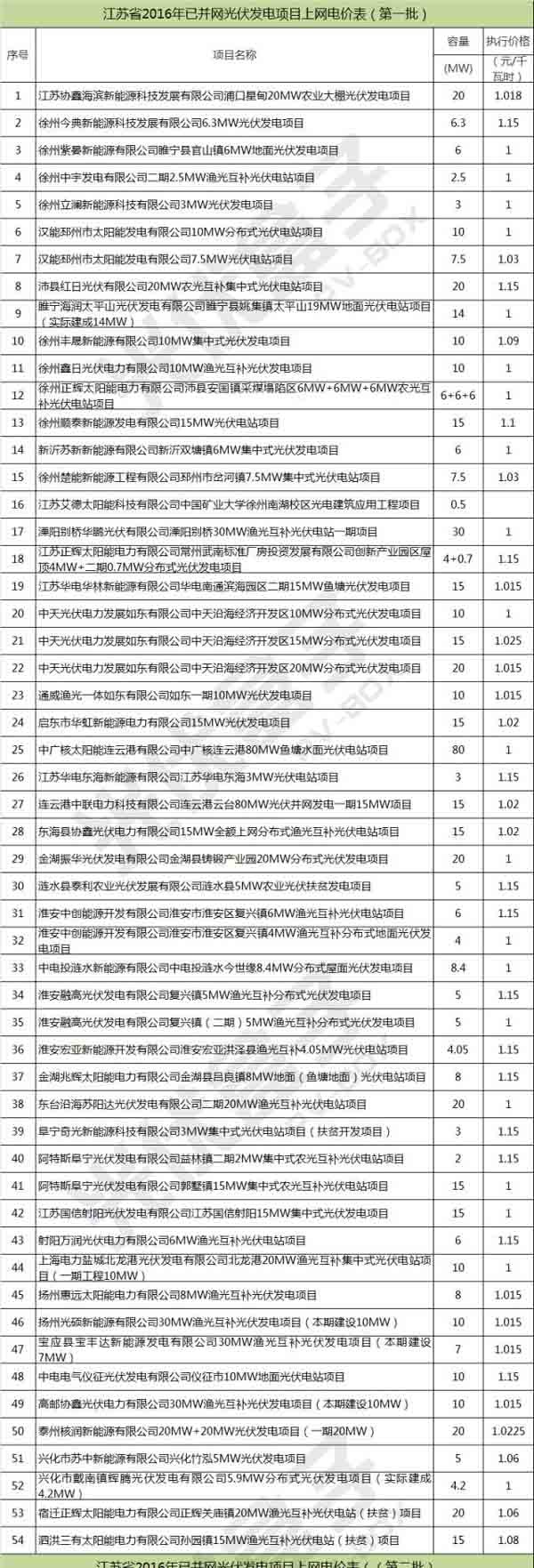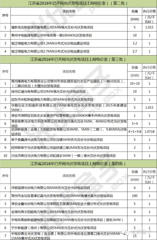 2016年江苏省已并网光伏项目详细名单(附详细项目名称电价,共4批)
