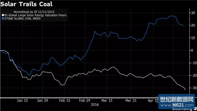 ▲蓝色折线为STOWE全球煤炭指数,白色折线为全球大型太阳能指数(source:Bloomberg)