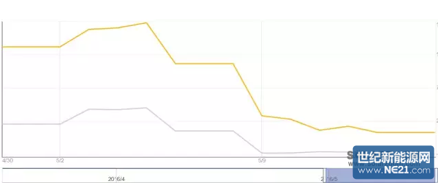 太阳能基本面获得改善,但彭博全球大型太阳能指数仍跌跌不休,其中一个原因是受到美国大厂SunEdison拖累,SunEdison营运状况恶化,股价从去年高点一路狂泻,到了2016年4月初还一度跌至19.5美分,终于在今年4月底声请破产保护。