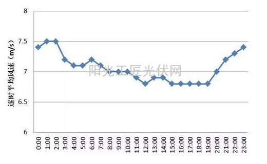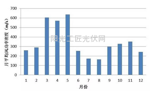 该风电场场内测风塔70m高度年平均风速分别为7.1m/s,年平均风功率密度348.0W/m2, 3~5月、10~11月风速风功率密度较大,6~9月风速风功率密度较小。从日变化上来看21:00~凌晨3:00风速风功率密度较大,8:00~19:00风速风功率密度相对较小。