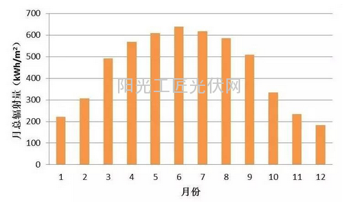 该地区近20年太阳能月总辐射量变化如下图所示。5~8月太阳能辐射量较大,11~1月太阳能辐射量较小。