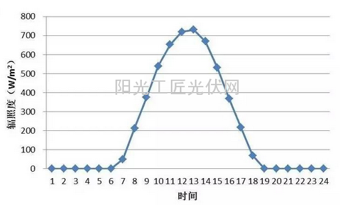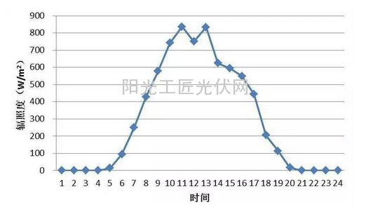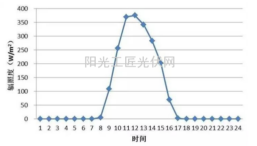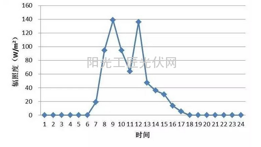 对距离风电场最近的辐射观测站四个典型日的辐射日变化进行分析,该站2014年春分、夏至、秋分、冬至四个典型日辐照度日变化见下图。除秋分日受阴雨天气影响外,其余三个典型日辐照在12:00~13:00出现全天最大值,主要集中在10:00~15:00,占全天的60%以上(夏至),冬至日达90%以上。