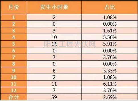 对光伏电站出力比较集中的时间段内(9:00~15:00),风电场的出力进行分析,筛选出风电场出力大于9万kW发生小时数见下表。