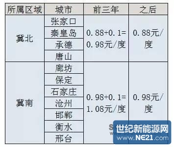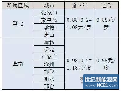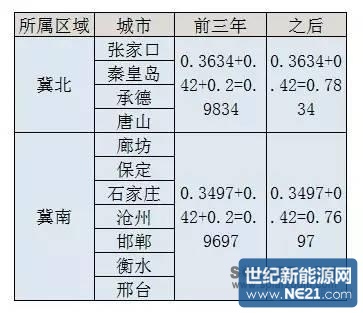 河北省电网由于各种原因分成了冀南和冀北两片区域,其中,保定、石家庄、廊坊、沧州、邯郸、邢台属于冀南,承德、唐山、张家口、秦皇岛属于冀北,两片区域分属不同的资源区,执行的光伏发电标杆上网电价不同,燃煤发电上网电价也不同。具体2016年的价格如下表。