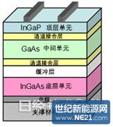 | 此次开发的三层堆叠式化合物太阳能电池模块(照片由夏普拍摄) | 此次的太阳能电池单元的结构(图:夏普) |