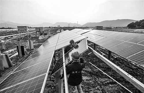 江西省新余市光伏发电项目总装机量达425兆瓦,已并网发电总规模达153.16兆瓦。图为5月18日,工人在江西省新余市分宜县德佑光伏35兆瓦“渔光互补”光伏电站项目上施工。