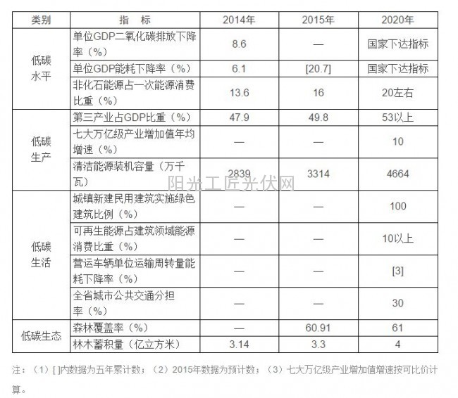 ——能源结构持续改善。清洁能源示范省创建成效明显,清洁低碳、安全高效的现代能源体系加快建成。到2020年,非化石能源占比提高到20%左右,煤炭消费量(不含外来火电用煤)占比降到42%左右,风电、光伏太阳能等非水可再生资源装机容量达到1310万千瓦。
