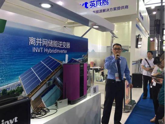 在展示现场,英威腾全球首次发布最新产品离并网储能逆变器。离并网储能逆变器是集充电,储能与光伏逆变,BMS电池管理系统等多功能于一体,可自动的判断出离网/并网模式,并接入智能电网,实现削峰填谷、自发自用等用电需求的新一代高效光伏逆变器。英威腾光伏科技副总吴建峰先生在现场全球首次正式发布了离并网储能逆变器,受到了广大海内外行业媒体以及客户的关注与好评。