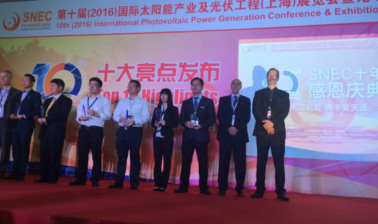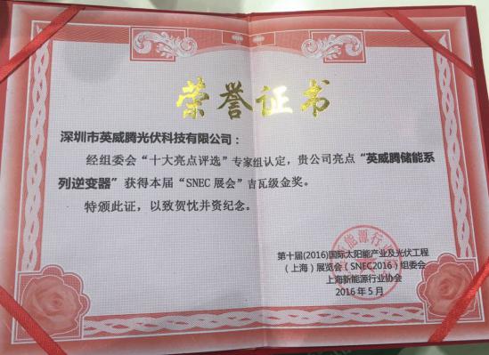 同时,英威腾携全新储能产品参与了2016年度光伏行业十大亮点奖项评比,经过激烈的角逐以及现场专家团的综合评定,结合现场观众的综合投票,英威腾荣获第十届SNEC十大亮点吉瓦逆变器金奖!
