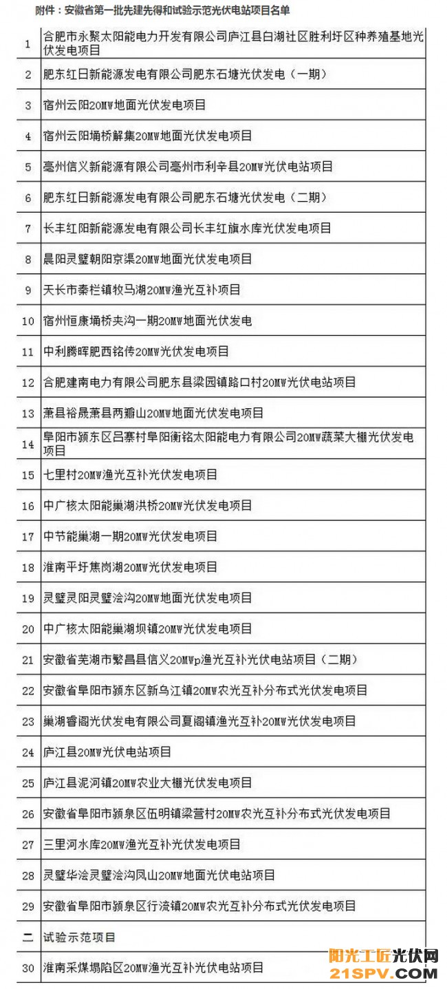 根据我局《关于进一步加强光伏电站项目开发管理的通知》(皖能源新能〔2015〕26号)和《关于完善“先建先得”分布式光伏电站管理的通知》(皖能源新能〔2016〕13号)等文件精神,现将国家下达我省2014年结转的30万千瓦和2015年追加的30万千瓦光伏电站建设规模,按照电站并网先后顺序,配置给合肥永聚太阳能庐江县白湖社区胜利圩光伏发电等29个先建先得项目和信义光能淮南采煤塌陷区水面光伏试验示范项目。