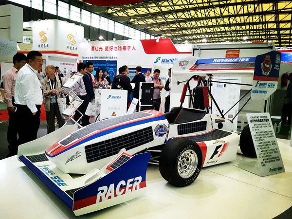在此次展会上,追日电气展出了一台光伏动力系统纯电动F1赛车,据追日电气现场技术人员介绍,这款车是追日电气赞助的武汉理工大学WUTE车队赛车,曾在2015年中国大学生电动方程式大赛上夺得“效能测试”第二名与“成本与制造评估”项目第三名的好成绩。现场我们可以看到车身铺满了柔性光伏电池片,据说这是国际上最高效率的太阳能电池片,再结合追日电气开发的智能光伏控制技术,可提升发电量30%,提升电动车的续航里程达30%。