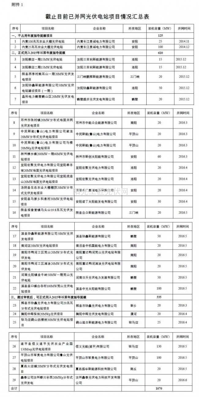 国家能源局自2014年起对光伏发电实施年度指导规模管理。国家能源局下达我省2014年度光伏发电规模指标75万千瓦(包括光伏电站20万千瓦,分布式光伏发电55万千瓦),2015年度光伏电站规模指标60万千瓦,共计135万千瓦。经与国家能源局衔接,2014年、2015年光伏发电年度指导规模可统筹安排。2015年四季度,我委以豫发改能源【2015】1384号、豫发改能源【2015】1631号下达了拟纳入年度指导规模管理项目(以下简称“已纳入两个文件项目”)共计164万千瓦。