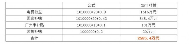 根据广州市高平谷的电度电价,折算广州市大工业用电平均电价大约为0.8元/度,按1MW所发电量全部“自发自用”算,预计20年理论收益(不计组件损耗、维护费用与税金):