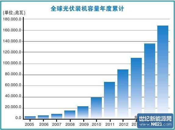随着太阳能光伏应用规模的不断扩大,太阳能电池的制造成本和系统应用成本逐渐降低。目前,太阳能电池价格为每瓦0.8美元左右。根据《2015清洁能源行业报告》,2014年全球可再生能源发电和燃料领域的投资额为3100亿美元,与去年同比增长16%,连续第五年超过当年对化石能源发电的投资总额。