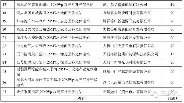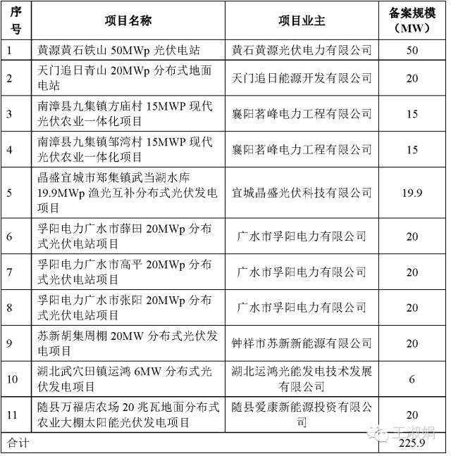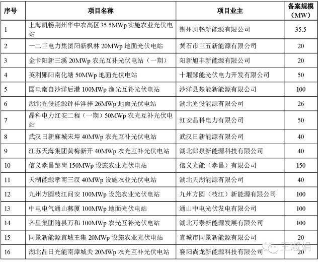 5月31日湖北省公布了:齐星集团随州淅河100MWp地面光伏电站、湖北能源集团麻城阎家河100MWp地面光伏电站、信义光能红安七里坪(二期)50MWp农业产业园光伏电站、金伏麻城中馆驿(二期)60MWp地面光伏电站、孚旭麻城中馆驿55MWp地面光伏电站等5个电站共新增并网225MW,入围上述剩余290MW项目名单,规模指标仅剩余规模指标65MW。