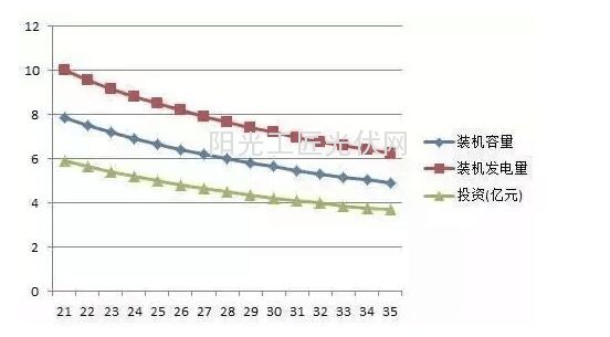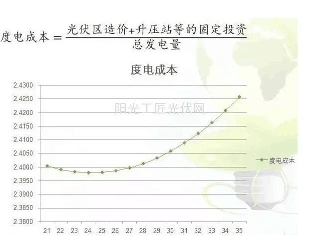 以上图项目为例,28度是这个项目计算得出的最佳倾角。但经比较,从21度到35度,随着倾角的变化,装机量都是在下降的,这三条曲线没有办法判断出哪个角度才能创造出最大收益。所以不能单以技术上的最佳倾角来判断电站的最大收益点。因此在设计上需要引入度电成本的概念。