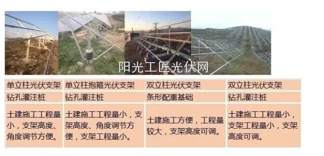 山地光伏电站支架主要采用固定式安装,安装方式主要包括单立柱光伏支架、单立柱抱箍光伏支架、双立柱光伏支架,各种支架具体区别如下表所示: