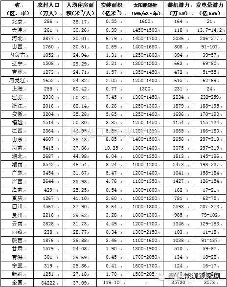 -住宅屋顶总面积。要从人均住宅面积得到可安装光伏板面积并不容易,城市居民多为高层建筑,农村住房更为复杂,有平房也有二三层小楼。本研究作了简化处理,认为城市平均楼层为10层,也就是说城市居民住宅总面积的10%为屋顶面积,假设农村50%的住宅面积为屋顶面积。