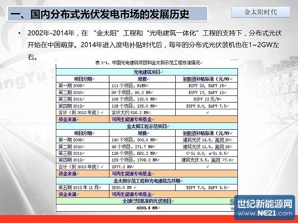 国内的分布式事实上做的还是比较早, 只是早期多以示范项目为主,比如科技方面示范的离网项目,或是一些小型的并网项目。真正发展可能还是09年,即金太阳时期。从 09 年到 12 年,金太阳加 BIPV, 一共批了 6+GW, 但只做了其中的一半甚至还不到。