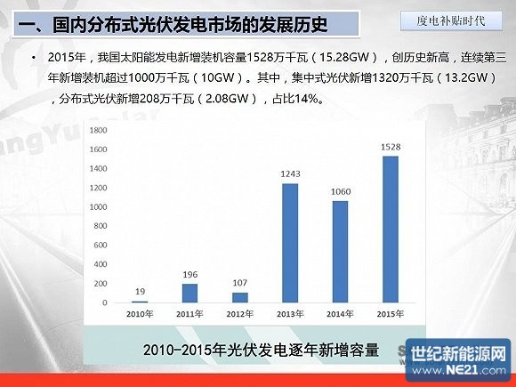 从 2013 年有了国八条以后, 2014、 2015 两年开始有度电补贴的分布式了, 2015 年一共做了 15.28GW, 创了新高, 这已经是连续第三年超过 10GW 的总量了,但是我们可以看到,其中真正的分布式只做了 2GW 左右,占比 14%。