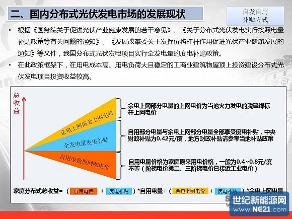 从 406 号文出了以后, 分布式有两种补贴方式,即自发自用余电上网和标杆电价补贴,但是基本上以前者为主。根据当年的国八条, 包括能源局对分布式光伏发电按照电量补贴的政策通知文件,现在基本都是在自发自用的基础上加上度电补贴,倘若你有用不掉的电要余电上网,那就是余电上网的价格加上度电补贴。