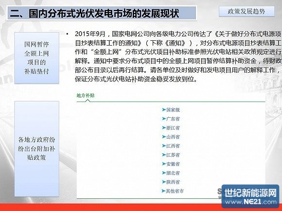 15 年 9 月份,国家电网底下的地方公司纷纷收到总部传来的通知,根据这个通知,全额上网的脱硫煤标杆电价以外的剩余补贴部分不再由电网垫付,全额上网的分布式项目也需要走集中式光伏电站的补贴申请目录才可以拿到补贴,但由于补贴目录的申请流程复杂,补贴到位滞后时间甚至超过 2 年,因此给分布式的发展带来了致命的打击。