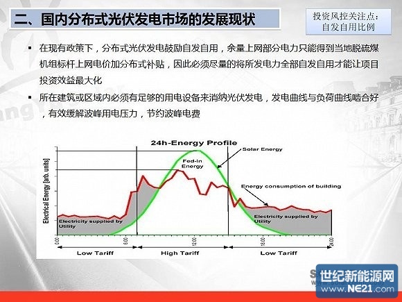 前文提到,从能源局的角度来讲更多的还是关注自发自用。那么对于自发自用电站,最重要的还是关注自发自用比例。如果自发自用比例过低,就会导致更多收益来源于脱硫煤电价,而脱硫煤的价格是远低于之前的网购电价的。 所以我们在分布式选址时,更多的还是要看当地的发电功率曲线能否和用电负荷曲线匹配起来, 尽量减小中间的差异,这样也就提高了我们的自发自用比例,提高了我们的收益率。