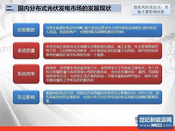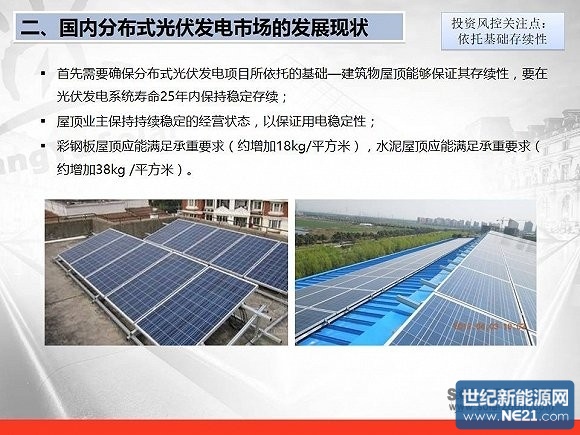 而收益其中的一个点,就是依托基础的存续性。这个可以分为两个方面来说,一个是屋顶本身的存续,也就是屋顶的承重和拆迁问题, 如果保证一个25 年持续稳定收益的话,首先要保证屋顶能够撑住 25 年,另一个就是业主能存续 25 年,不会跑掉。这样起码在一个 20 年的 PPA 里收益可以得到保证。