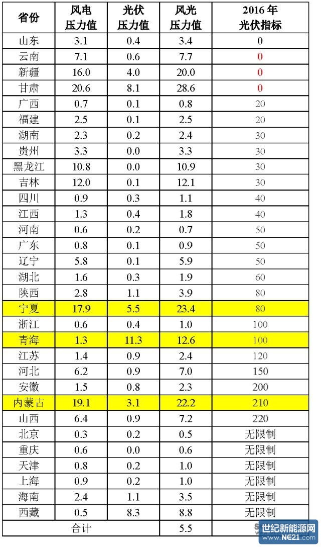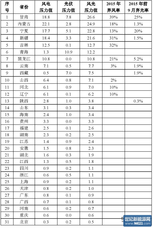 从上表可以看出,甘肃、内蒙古、新疆、宁夏4个省份的风光压力值已经超过20,即风电、光伏项目的发电量已经占到该省用电量20%以上,限电压力已经非常大,2015年的限电比例也非常大。