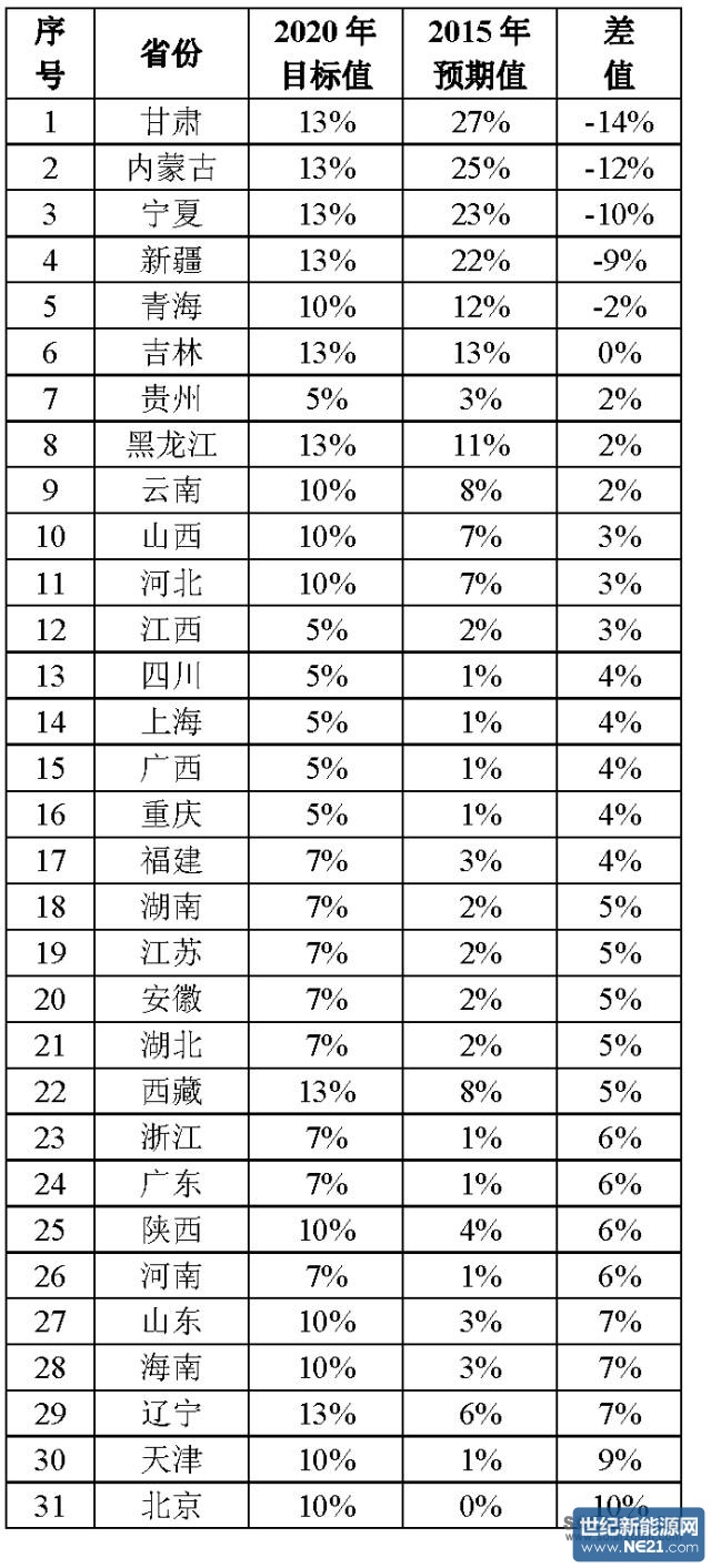2)分析各省的非水可再生能源发电量的比例,与国家能源局在《关于建立可再生能源开发利用目标引导制度的指导意见》中要求的比例进行对比;