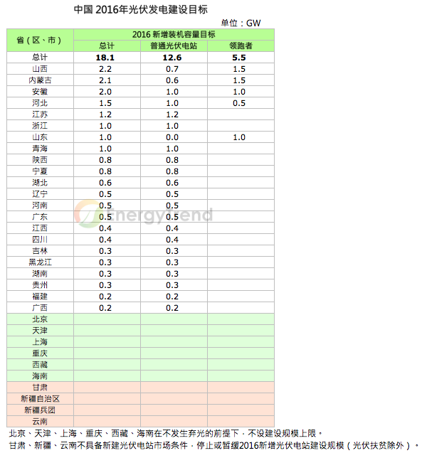 端午佳节前夕,中国国家能源局终于出台《国家能源局关于下达2016年光伏发电建设实施方案的通知》(下称《通知》)。《通知》指出,2016年全国新增光伏电站建设目标为18.1GW,包括普通光伏电站12.6GW,以及光伏领跑技术基地5.5GW。