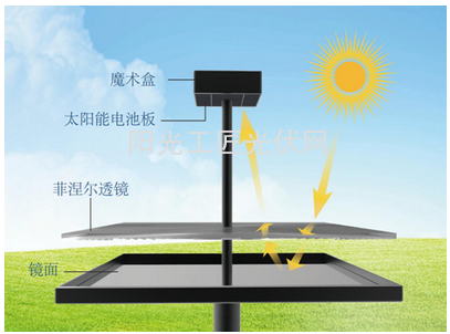 据了解,在即将召开的德国慕尼黑国际太阳能展上,博立将展出基于BolySolar技术的第一个产品原型--BolySolar聚光器。该产品亦称为BolySolar太阳能柱,是一类专为太阳能利用而设计的聚光系统,由魔术盒、太阳能电池板、菲涅尔透镜、镜面等构件组成。其柱型基本结构如下图:
