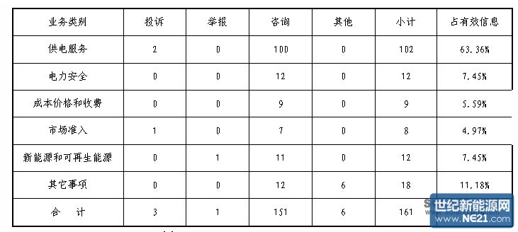 从业务分类情况分析:供电服务102件,占有效信息的63.36%;电力安全12件,占有效信息的7.45%;成本价格和收费9件,占有效信息的5.59%;市场准入8件,占有效信息的4.97%;新能源和可再生能源12件,占有效信息7.45%;其它事项18件,占有效信息11.18%。(2016年5月份有效信息业务分类情况见表一)
